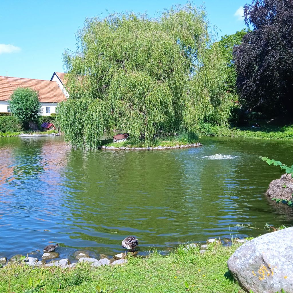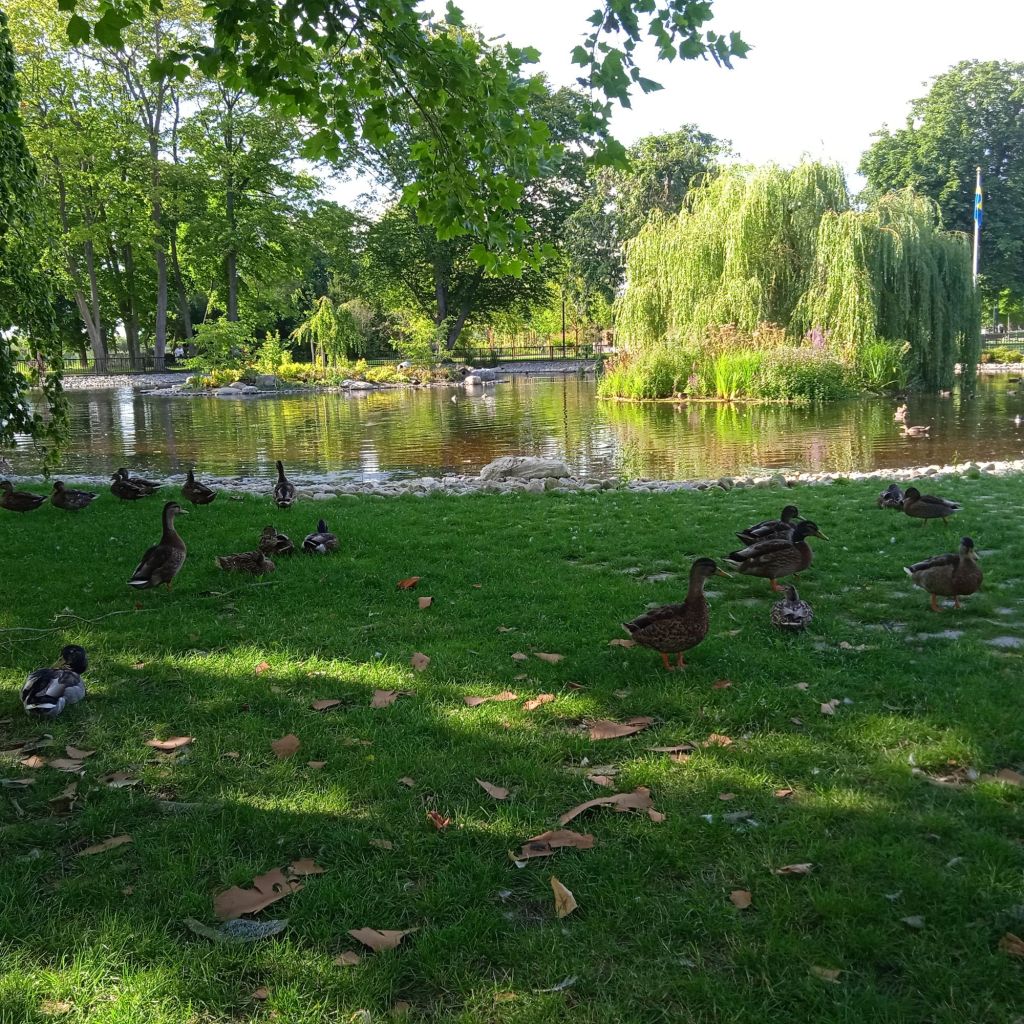 … och tittade på änderna, både stora och små, i mysiga dammen, änderna har sina små hus lite varstans.