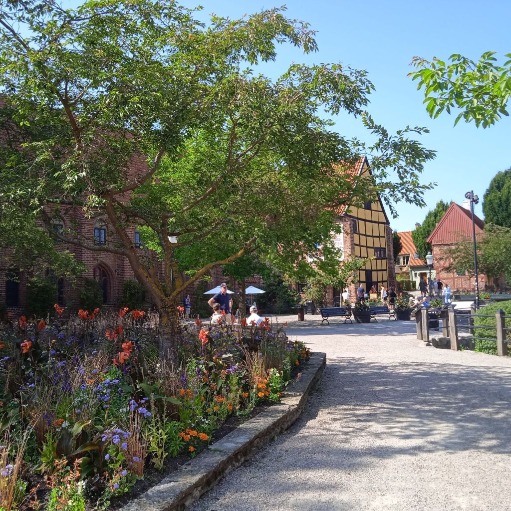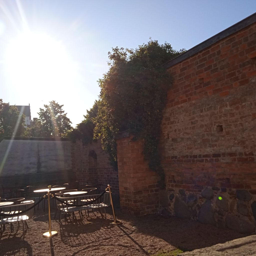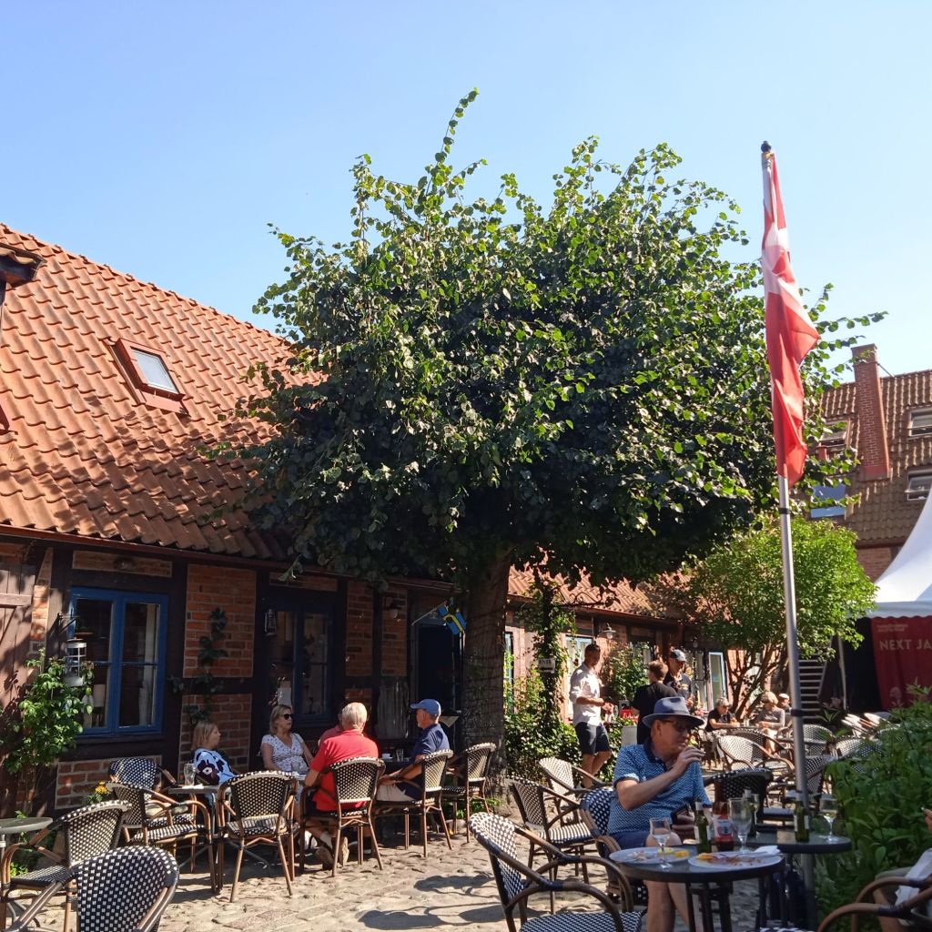 Till slut hittade jag en liten folktom gränd, så jag satte mig ner där och kissade i rännstenen … Nä, jag bara skojade, men jag såg ett gårdscafé som heter Hos Morten, så in dit gick jag. Lagom stort/litet och massa skugga vilket jag verkligen behövde, förutom en toalett … och ett plus att det är nog ett av de mysigaste caféer jag varit på. Kanske inget att rekommendera för riktigt gamlingar som har svårt att gå och hålla balansen, då gården var klädd i kullersten och andra runda stenar som inte var alltför platt och gåvänligt. Vet inte hur många gamlingar som höll på att ramla, och skräckslagna blev de med ett litet tjut och tappade andan …