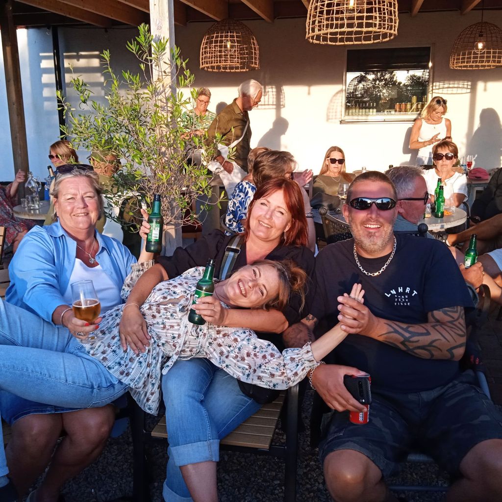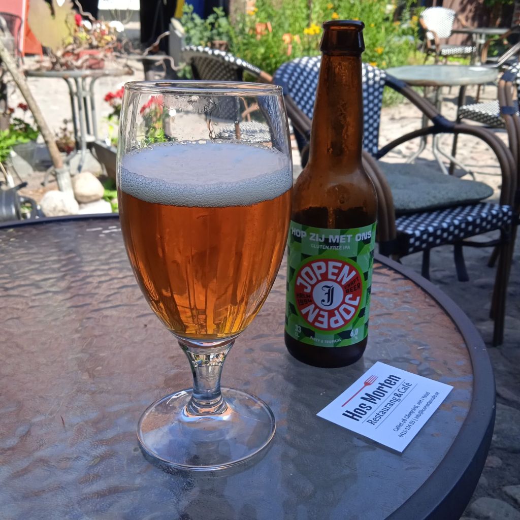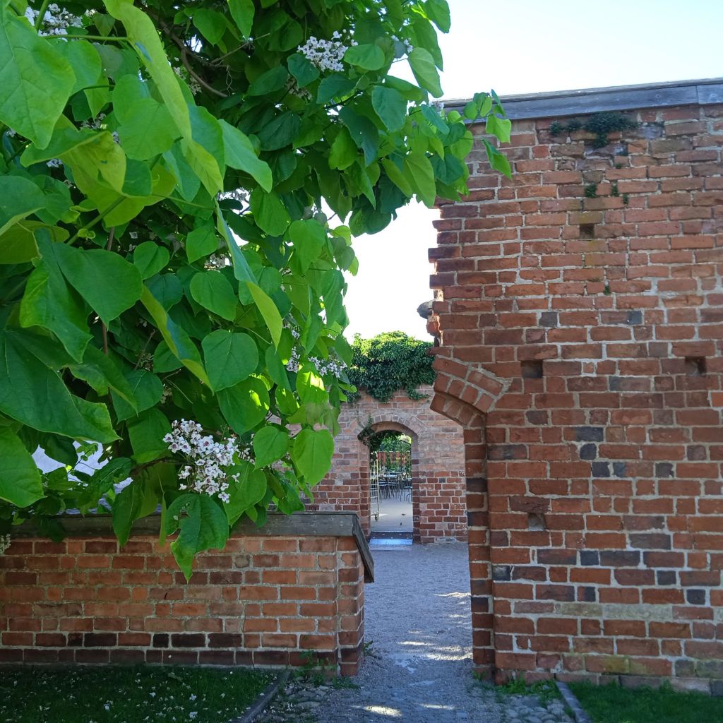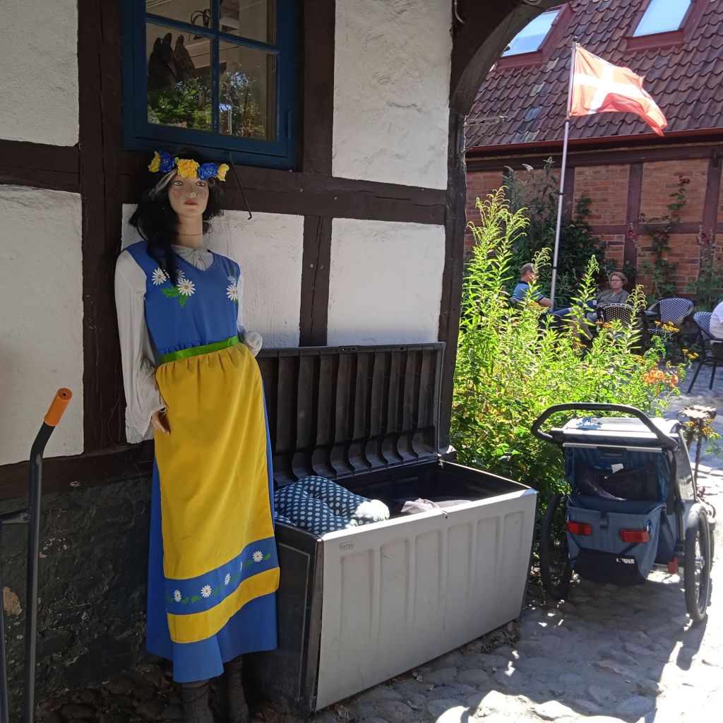 Till slut hittade jag en liten folktom gränd, så jag satte mig ner där och kissade i rännstenen … Nä, jag bara skojade, men jag såg ett gårdscafé som heter Hos Morten, så in dit gick jag. Lagom stort/litet och massa skugga vilket jag verkligen behövde, förutom en toalett … och ett plus att det är nog ett av de mysigaste caféer jag varit på. Kanske inget att rekommendera för riktigt gamlingar som har svårt att gå och hålla balansen, då gården var klädd i kullersten och andra runda stenar som inte var alltför platt och gåvänligt. Vet inte hur många gamlingar som höll på att ramla, och skräckslagna blev de med ett litet tjut och tappade andan …