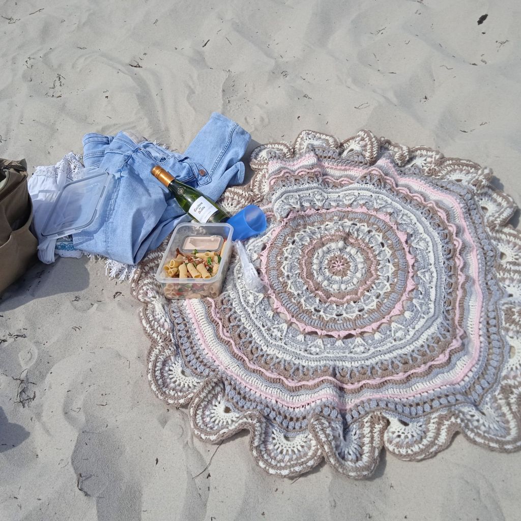 Den var lite besvärlig och trixig i början, men jag kom ganska snabbt in i alla kluriga mönster, speciellt ”bubbelraderna” … hade även svårt att få till de stora flätorna/kedjorna, då jag tyckte det var oklart hur man gör i videon, men hittade en annan superbra video som visade mer tydligt :-) Efter några varv blev det enkelt och virkningen flöt på …