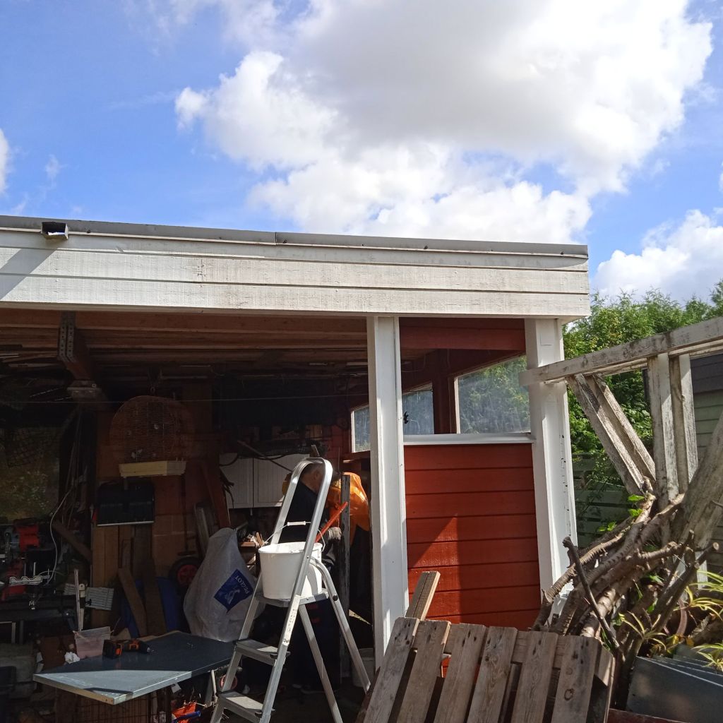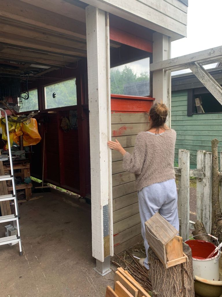 … och målningen slutade inte bara på lilla nya väggen, det blev två röda pelare … sen blev det vita, vita pelare och ”listen” över carporten, sen spårade det ur.