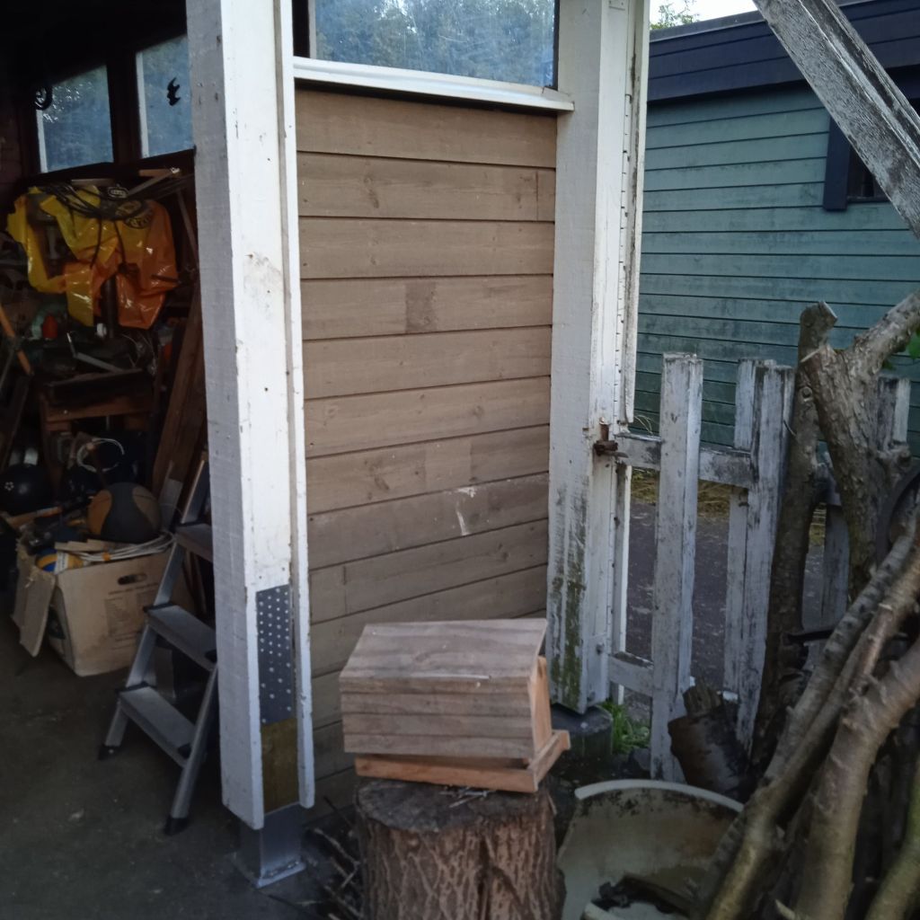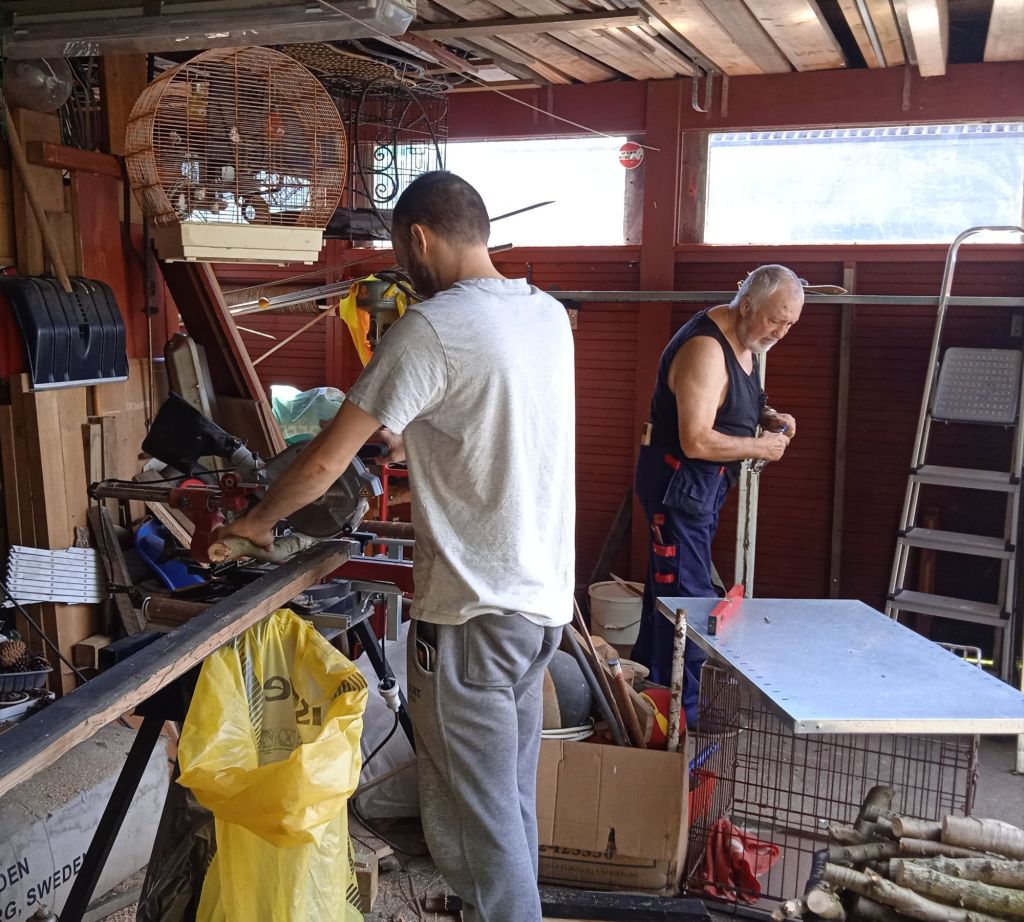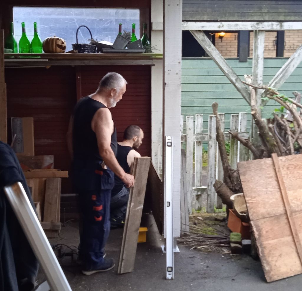 Medans jag var i Åhus så fick far ett ryck att bygga en liten vägg i carporten, för att skymma lite maskiner och annat + bygga några rejäla hyllor, med sonen till hjälp.