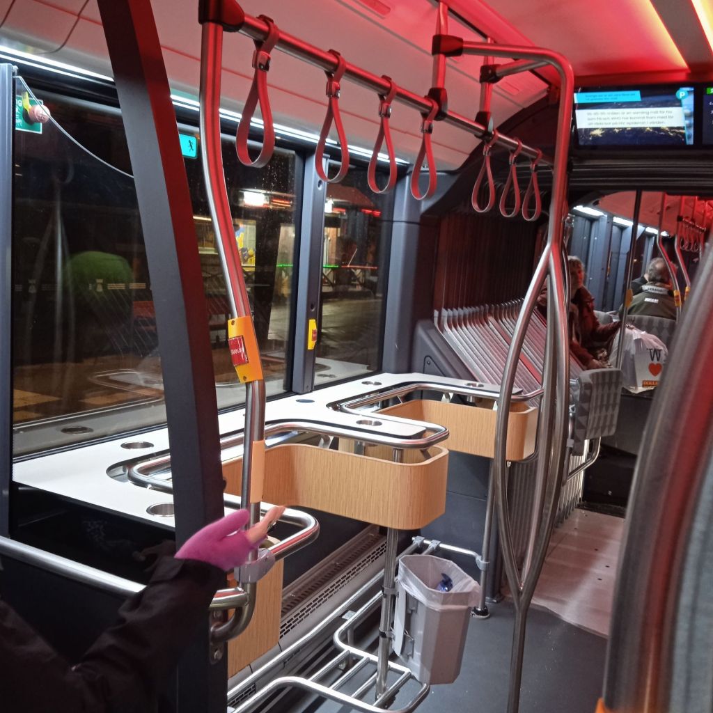 Nä, skojade bara. Det började regna, och då är det inte så kul att staka sig fram på ett par skenor. Vi hoppade på en buss, och ibland när jag kommer till Sverige så undrar jag om jag levt under en sten långt ute i skogen. Jag tappade hakan och frågade syster, vad sjutton pågår? Har de barbord i bussen?! Är de kopphållarna till för stressade morgonmänniskor som tar sitt morgonkaffe med sig i farten till jobb? Men hon sade något om mobilladdning, jag vet inte. Vet bara att jag aldrig sett detta i mitt liv.