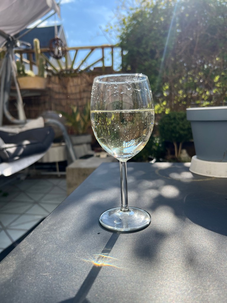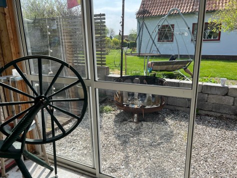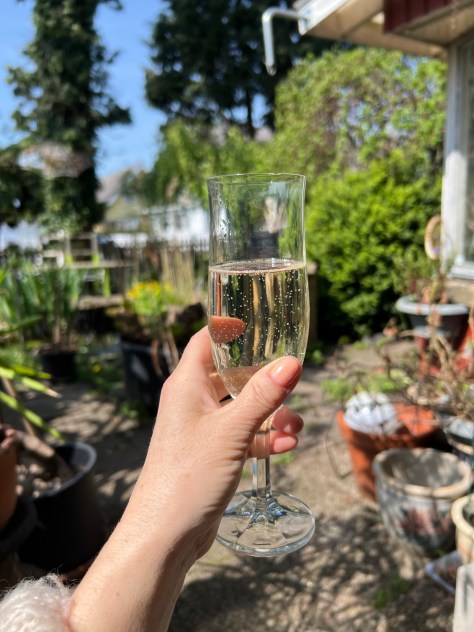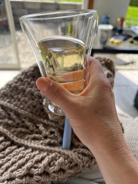 Jag hade lite aningar, så jag släpade med ett virkprojekt och vi satte oss i uterummet med kaffe. Efter ett tag smög Nana iväg, och kom tillbaka med ett litet glas vin. Och jag kan säga så här; man kan lita på magkänsla, ofta. Jag satt med ett litet glas vin och virkade …