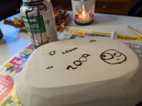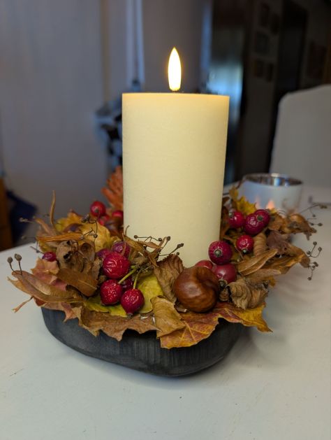 Jag klippte ut lite kartong och började limma fast löv, gick inte så bra, tror limmet inte var gjort för det. Några löv fastnade medans andra inte, så det slutade med att jag bara lade kastanjer, bär och löv lite huxflux runt ett batteridrivet ljus. Blev ändå ganska bra i slutändan. Kom på att sonen hade gjort en träskål på träslöjden för ett x antal år sedan, den betsade jag och sedan lade på min dekoration på den.