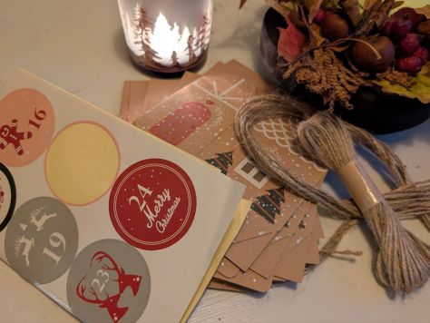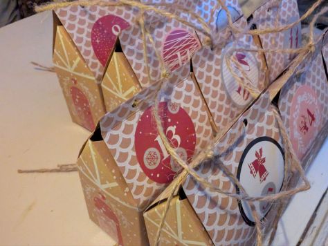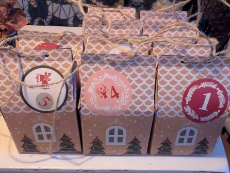 Hämtade ut ett paket med lite gott och blandat i, där bland annat en julkalender. En liten DIY, små hus för varje dag, klisterlappar med 1-24 och jutetrådar. Den håller jag och pysslar ihop till sonen … jag säger så här; ”Man är aldrig för gammal för en julkalender.” Så himla gullig.