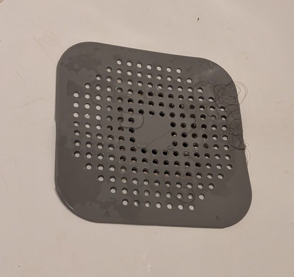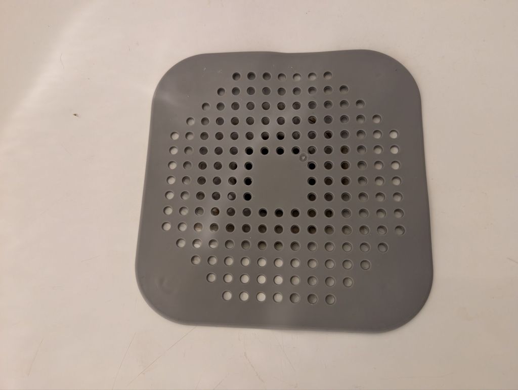 Testade en ny avloppsskydd i silikon, men jag vet inte … nog lite för stora hål, men den skyddar avloppet lite mot hår. Fast rullen jag köpte, om ni minns, samlar hår och annat mycket bättre. Så det blir nog rullen igen. Ni som inte vet, rullen får man klippa till storleken själv, och det är små klister remsor.