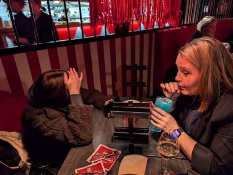 Jag och syrran delade en flaska vin och nyblivna artonåringen drack en ”giftig” virablåtira-blå drink som syrran provsmakade. Tyvärr ville inte den unga vara med på bild :D