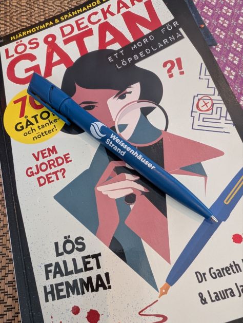 Jag såg en kul krimbok som jag var tvungen att köpa, en historia och man ska försöka lösa små uppdrag, ganska svåra tycker jag, så har inte kommit så långt.