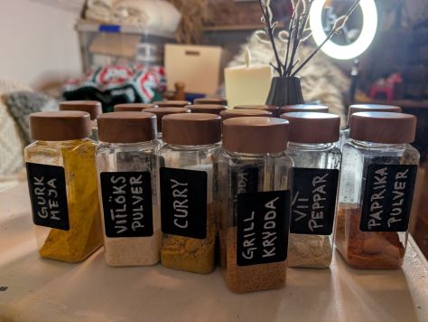 Shopping fortsätter … men nu har jag köpförbud, då jag kommer ha nästan tre veckor ”fritt”. Har iallafall fått hem de här kryddburkarna som jag är väldigt glad för, har fyllt dem lite i smyg för att se hur de ser ut. Har sett fina hyllor på IKEA för en bra peng som jag tänker ha dem på. Bry er inte om bakgrunden i bilden, det är min flytthörna som växer :-P