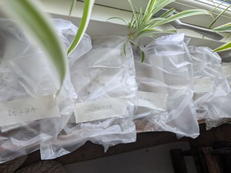 Jag testade att förså några fröer i plastpåse, med lätt vått papper, och jovisst det fungerade, både rödbetor och koriander började gro …