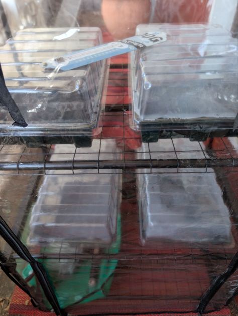 Ett brätte med koriander, ett brätte med rödbetor och de andra två delades med basilika och persilja, och ett med röd/gul paprika och cayenne … så vi får se hur det går där ute i ”växthuset”.