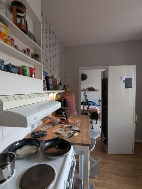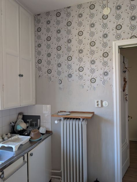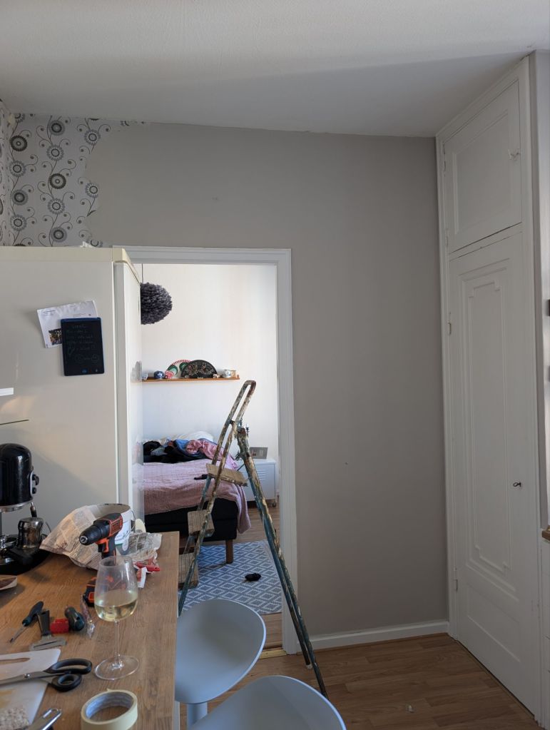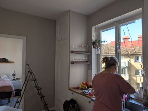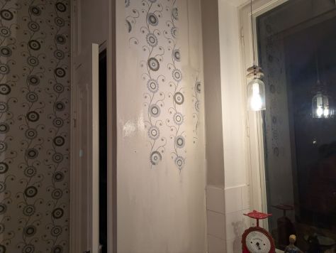 Efter det började vi måla i köket, det lilla blev en enorm skillnad, men jag har fortfarande inte sett det färdiga resultatet. Den mönstrade tapeten ”åt” upp köket, så efter lite färg så blev det så mycket luftigare och ser rymligare ut.
