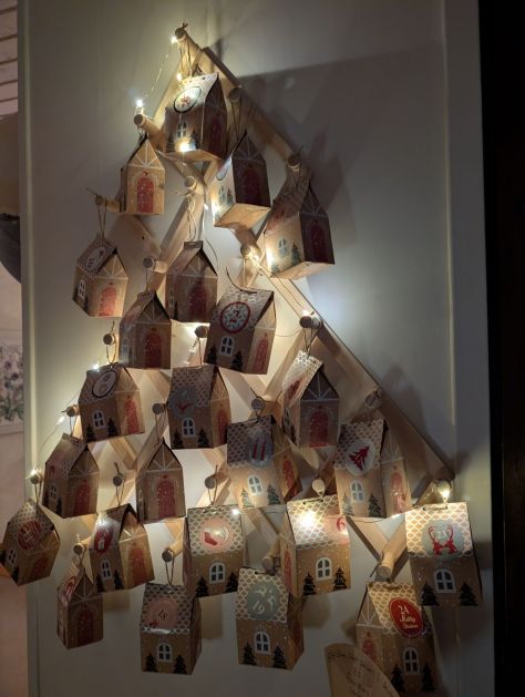 … som jag klädde med de små kalenderhusen som jag beställde från Temu, så himla gulliga, och med en liten ljusslinga från Rusta på det så blev den toppen.