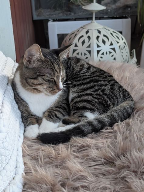 Nu gör jag som katten igen, sätter mig på balkongen och andas frisk luft för att sedan lägga mig igen framför en film och fortsätter virka … jag virkar en tröja, har virkat en likadan för ett tag sedan fast i annan färg, och den har jag glömt visa! Det kan jag göra när denna är klar som jag håller på med. Egentligen borde jag bli klar med ett annat projekt, men orkar verkligen inte nu, gör klart det imorgon … en liten hallrenovering är det …