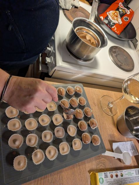 Efter målningen tänkte jag fixa lite julgodis, så allt jag hade till det fick följa med till syrrans bo. Vi började med choklad, hasselnötskräm, jordnöt och toppade med nougat, lager på lager.