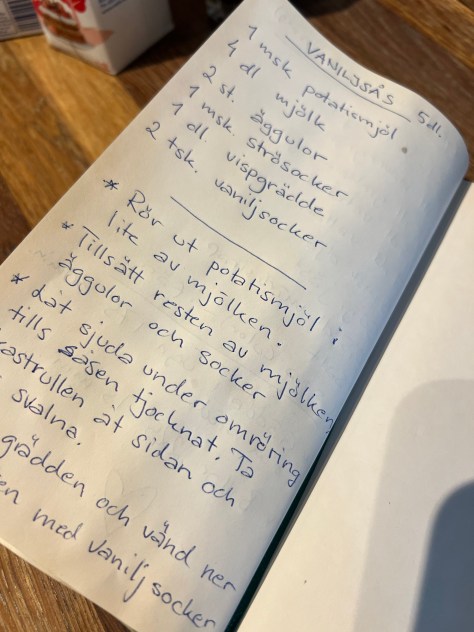 Nu ska jag göra äppelsmulpaj … gjorde för första gången egen vaniljsås, så himla god! Ska aldrig köpa färdig … Vi hörs!