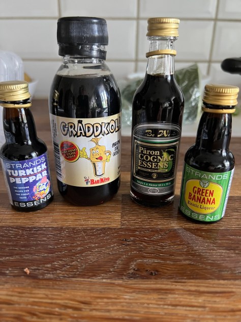 Jag köpte sådana här små flaskor som man ska smaksätta sprit med … men jag tänkte att jag provar smaksätta glass med dem, tihi … Invigde min form för glasspinnar, köpt på Panduro om någon undrar. Tror det var 50 st. träpinnar med formen.