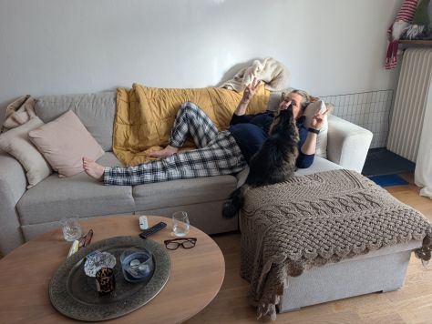 Söndagen låg vi pall i soffan, jag med den förbannade snuvan med rinnande näsa växlande med stopp i näsan som jag haft i hundra år som inte velat gå över.