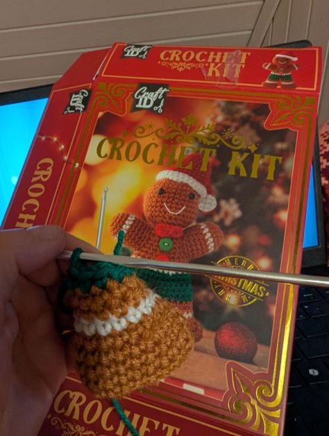 … första virk kit jag köpt, och förmodligen det sista, men det var ändå rätt kul att virka ihop en liten pepparkaksgubbe. Den tog lite tid att göra, för jag fattade nästan noll av beskrivningen, dessutom var jag tvungen att ha ett förstorningsglas för att kunna läsa texten, så pytteliten var den. Tur jag har virkat så mycket som jag gjort, annars hade jag nog inte klarat av att virka den.