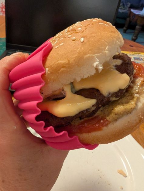Men … som ni vet är jag tvungen att köpa massa nödvändiga saker till mitt nya kommande hem, och ibland slinker det ner några onödiga prylar, som för ett exempel, Hamburgerhållare. Men som jag då som inte kan äta hamburgare utan att det blir massa slafs och rinnande dressing över fingrar, händer och armar, så blev detta köp ett toppenköp för mig. Inte ett kladd på mina händer, fi fasiken vad bra.