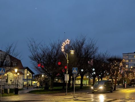 Jo, alltid mörkt när jag går till jobb, och ofta börjar det skymma när jag går hem, men det gör inget, mysigt med massa julbelysningar i byarna som jag befinner mig i och passerar.