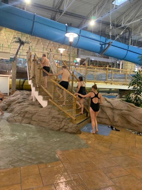 Bilden nedan, i rad gick sonen som tog täten, syrran och jag sist på väg upp till den blå vattenrutchbanan. Första och sista gången! Jag tappade helt kontroll över min kropp när tunneln blev kolsvart, visste absolut inte om jag var upp o ner, sidleds, bak o fram, eller vad. Blev rätt rädd faktiskt, tills ljuset kom och jag plaskade ut från skräckfärden, hahaha …