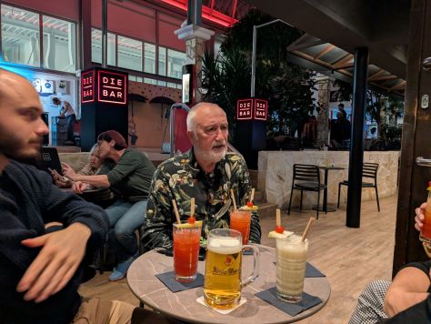In till gallerian, nästan fullt på Osteria, och vi gick till nästa … alltså vet ni vad. ALLA restauranger stängde klockan 21:00!!! Och vi kom ca 20:45 så ingen tog emot oss, va f**! Det slutade med att vi fick svälta den dagen- Nä, men vi gick till Cocktailbaren Die Bar, jag tog en stor öl, resten av familjen tog drinkar, det blev nachos med salsadip, och det tog 1 TIMME att få in drickat!!! Hur långsamma får man vara, bordet bredvid tröttnade och gick, de satt där när vi kom och gjorde beställning före oss, och vi fick deras drinkar gratis. Nä, fy vilken tid det tog. Servitrisen gjorde allt hon kunde och var riktigt bra, det var han den där cocktail makaren som var extremt långsam.